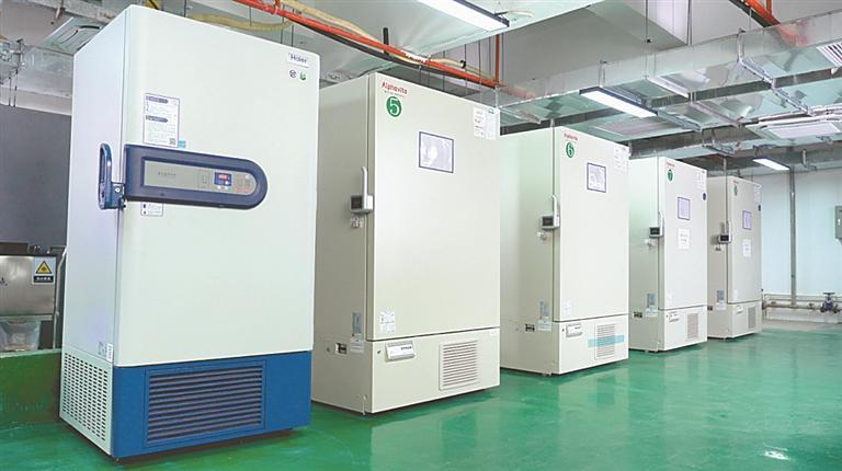 龙华区人民医院生物样本库位于医院妇产大楼,占地面积460余平方米。内部功能合理分区,设有样本接收/分发区、样本处理区、样本质控区、低温冰箱保藏区、超低温冰箱储存区、深低温液氮储存区、办公室、资料室、信息处理监控室、洗消间和耗材库等。配备了样本处理、质控和保藏所需常用仪器设备,如台式高速冷冻离心机、生物安全柜、移液器、超低温冰箱和气相液氨罐等,还配有程序化冷冻仪、全自动化超低温储存系统、深低温储存系统等高端仪器设备。现有设备可保藏样本达50万份。
