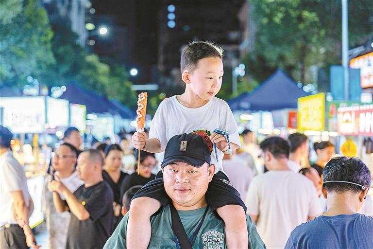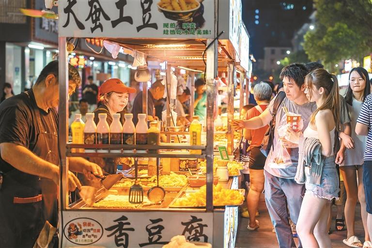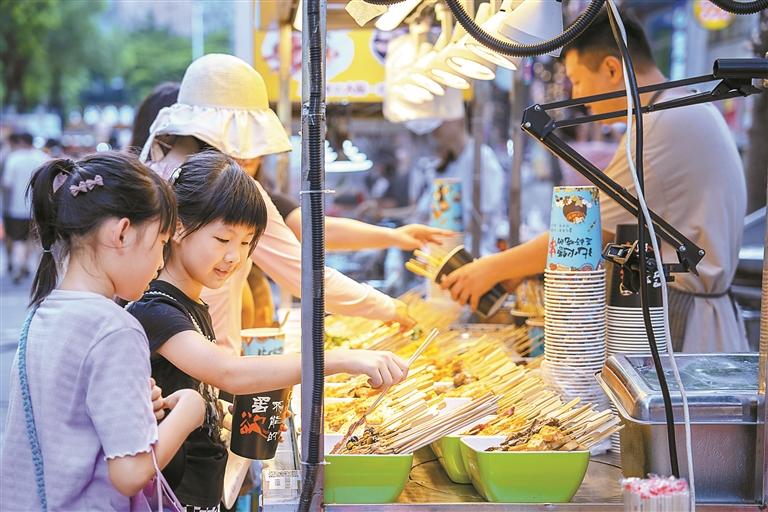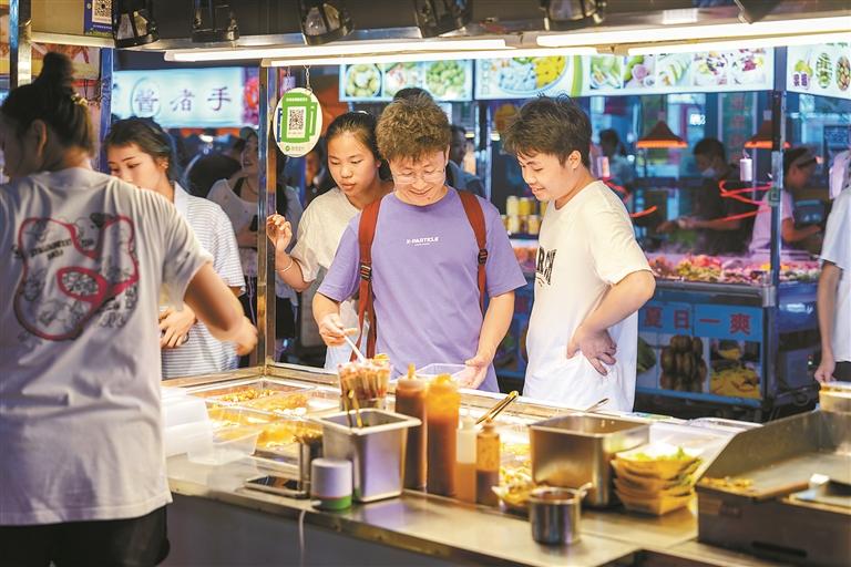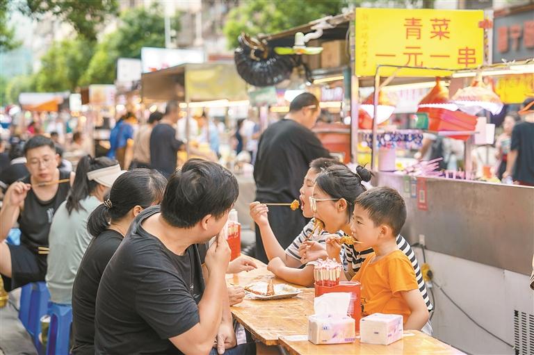 烟火升腾中,游客田女士约三五老乡寻一张桌子围坐,说说心事、聊聊生活,音乐声、欢笑声、摊主的招呼声、酒杯的碰撞声,声声入耳,热闹非凡,微风吹过,暑气消散,身心放松了,兴致也更浓了。