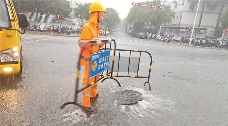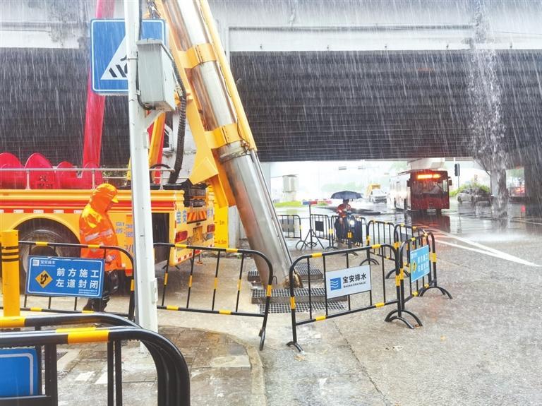 宝排员工在固戍迪福路处理积水。
