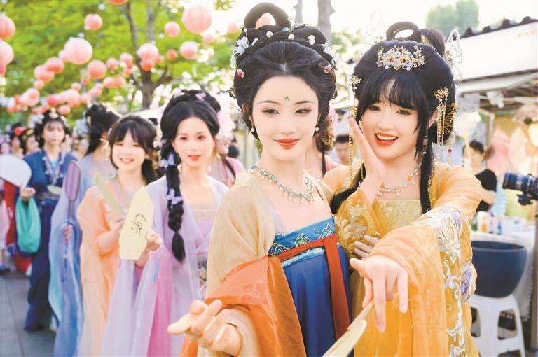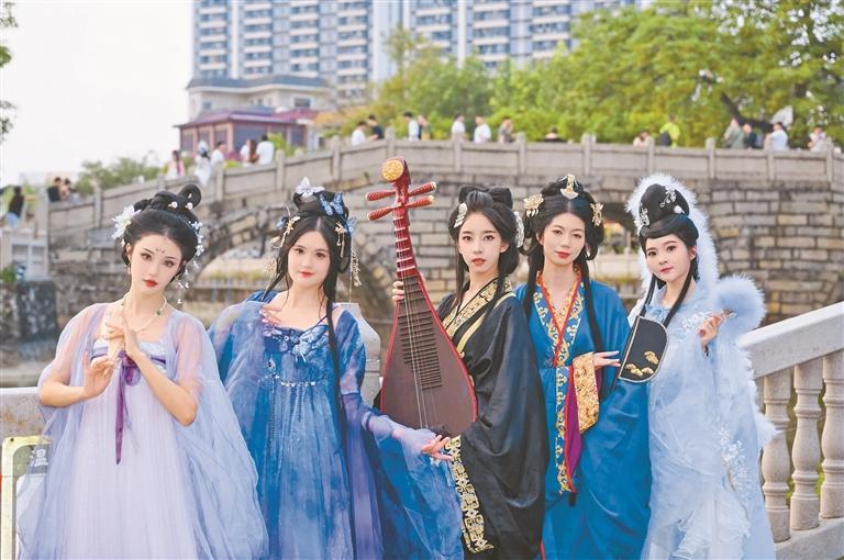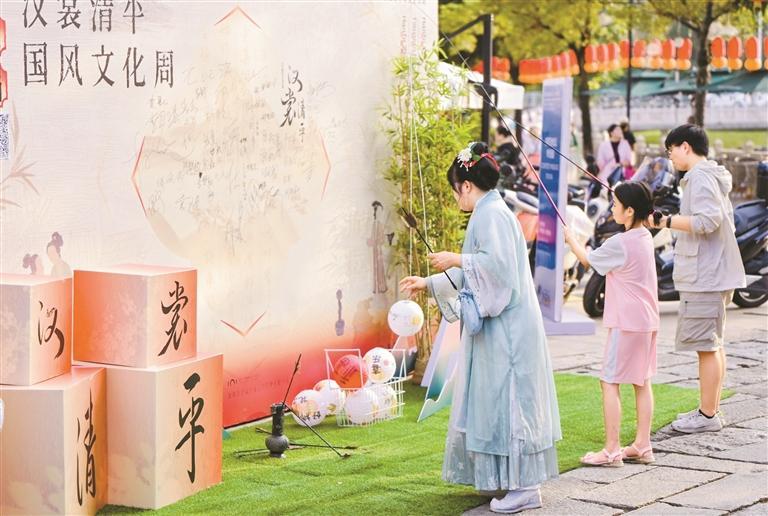 国风互动游园活动中,投壶、射箭等传统游戏让游客们亲身体验到了礼乐文化的优雅风尚。每一处历史古迹和汉服同袍们相得益彰,定格成一张张古风大片,成为朋友圈里的热门打卡点。汉服爱好者们在古桥上漫步,在湖边小憩,手持折扇、步履轻盈,演绎出秋日里的国风之美。
