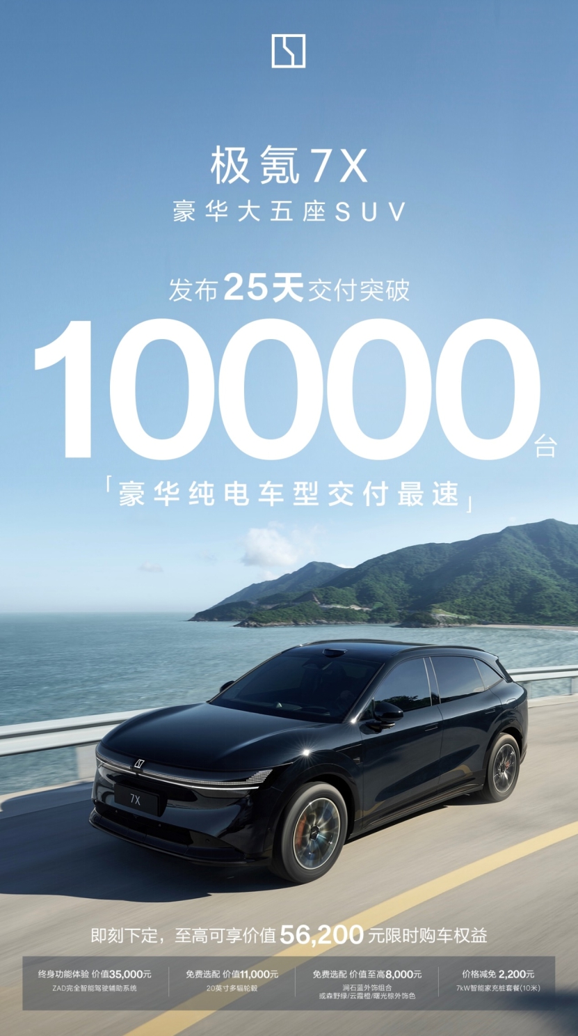 刚过去的9月,极氪强势上市发布全新车型极氪7X,该车型定位豪华大五座SUV,官方零售价为22.99万元起,上市第二天即开启百城千人规模交付。极氪7X作为一款豪华大五座SUV,不仅各种高端配置应有尽有,同时还从用户的实际需求出发,不跟随市场已有的惯性思维,打造新能源时代最好的SUV,再加上绝对的安全、超强的性能、舒适的空间、以及硬核的智能等核心优势,凭借极致性能和空间优势,极氪7X从预售到正式上市,短短25天的时间里订单量突破10000台,截止至10月极氪已累计交付超过35万台,持续刷新交付纪录。