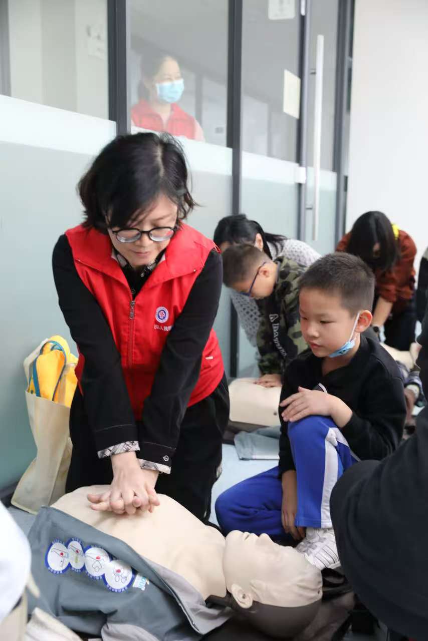 活动现场还设置了亲子互动环节,家长们和孩子们一起参与到胸外按压和AED操作的练习中。只见田同学在妈妈的指导下,按压着模拟人的胸口,还不时抬头看看妈妈,确认自己的动作是否标准。