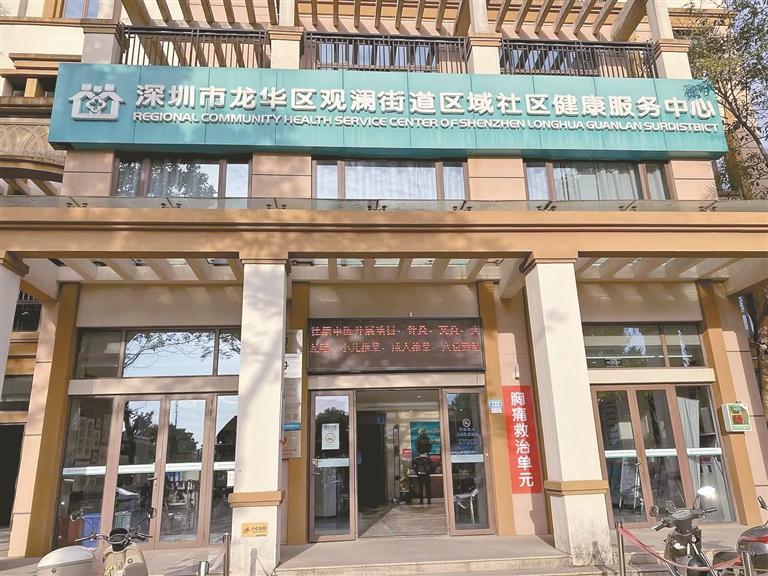 ▲观澜街道区域社康中心门口挂有胸痛救治单元牌子。