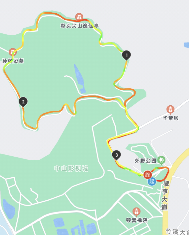 (签到领物资)孙中山故里旅游区中字广场—孙中山故里旅游区中山影视城中心舞台(起点)—孙中山故里旅游区犁头尖山停车场—孙中山故里旅游区犁头尖山—孙中山故里旅游区中山影视城中心舞台(终点领奖牌)