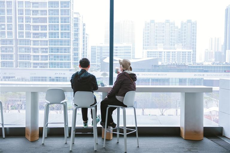 市民在深圳美术馆(新馆)三楼的开放式咖啡厅品尝咖啡。