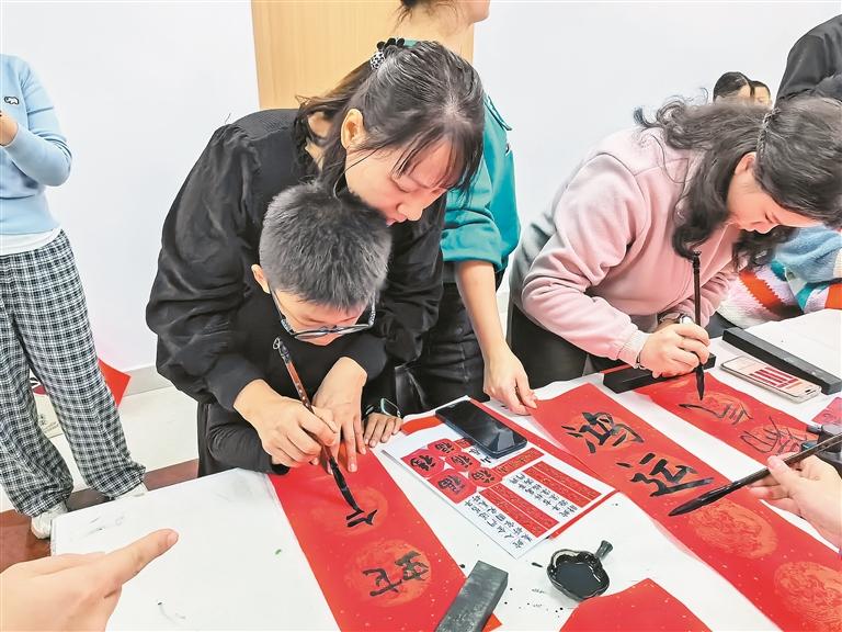 最引人注目的当属亲子写对联环节。家长们大手握小手,共同挥毫,写出饱含新春祝福的佳联。红红的对联纸映衬着一张张笑脸,书写出的不仅是新春的祝福,更是亲子相伴的温馨时光。