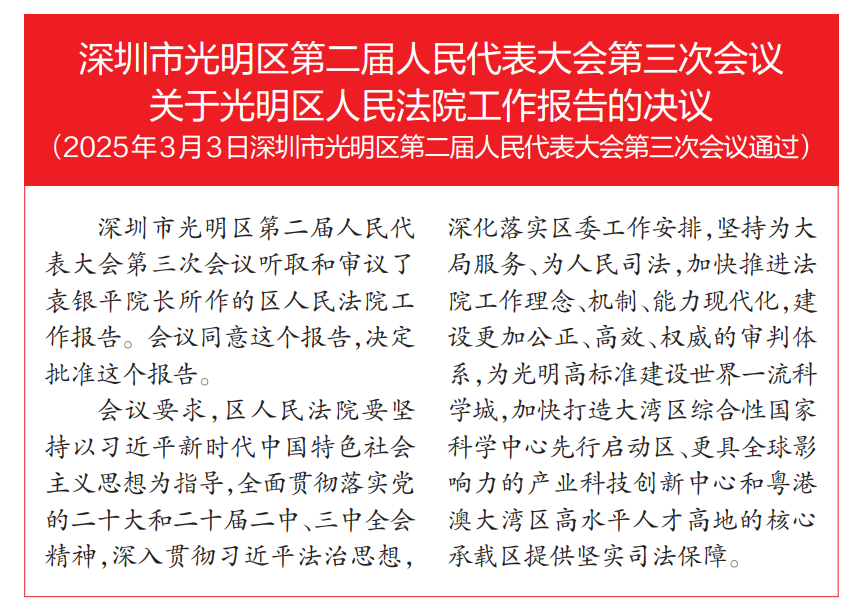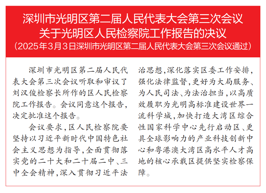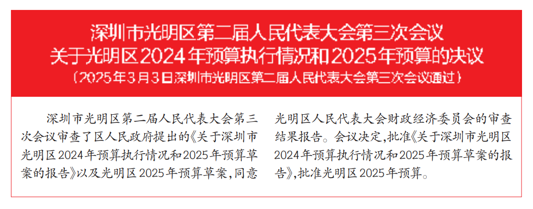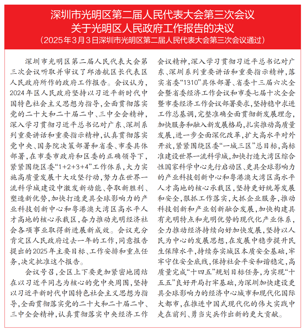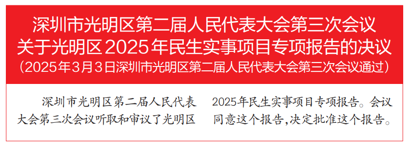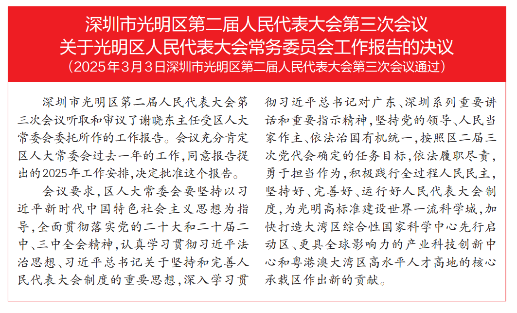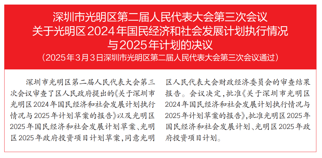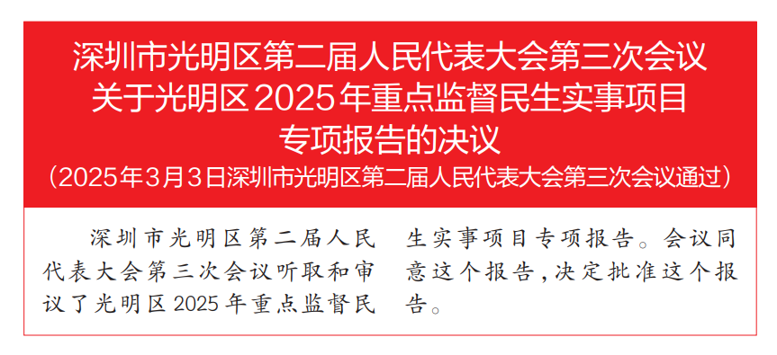 会议表决通过了关于光明区人民政府工作报告的决议、关于光明区2024年国民经济和社会发展计划执行情况与2025年计划的决议、关于光明区2024年预算执行情况和2025年预算的决议、关于光明区人民代表大会常务委员会工作报告的决议、关于光明区人民法院工作报告的决议、关于光明区人民检察院工作报告的决议、关于光明区2025年民生实事项目专项报告的决议、关于光明区2025年重点监督民生实事项目专项报告的决议,决定批准这八个报告。