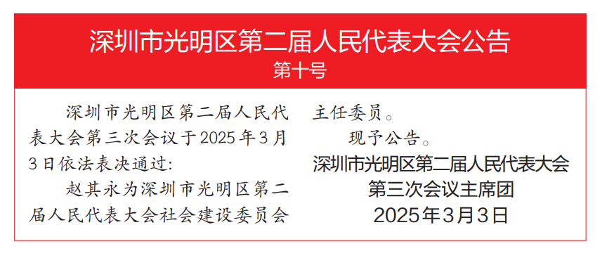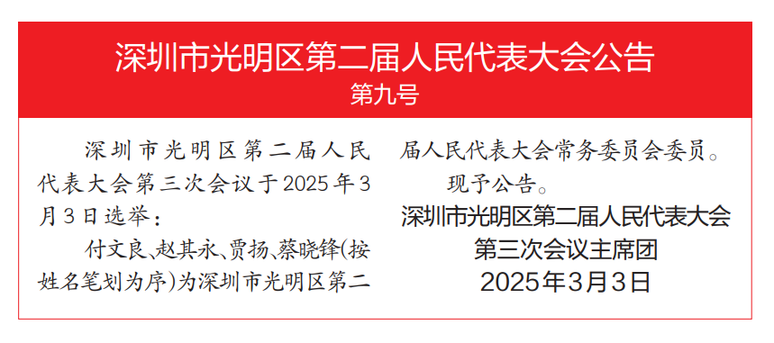 3月3日下午,光明区二届人大三次会议圆满完成各项议程,胜利闭幕。会议批准政府工作报告等八个报告,选举产生了四名区二届人大常委会委员,表决通过区二届人大社会建设委主任委员名单。