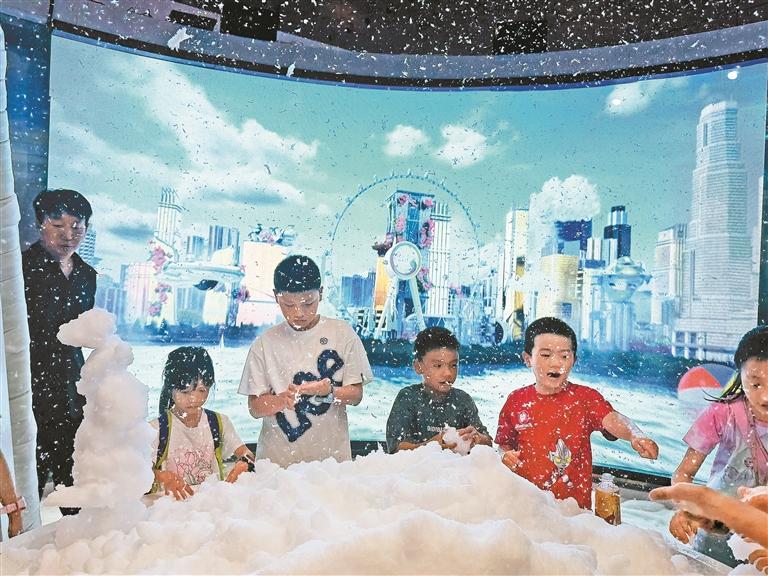 全球最大室内滑雪场——前海冰雪世界缩小版今年也被搬进了宝安展馆,成为本届文博会网红打卡地,半开放设计的冰屋中,造雪机持续制造真雪,让观众纷纷感叹:“感觉踏入了现实版冰雪奇缘梦境。”这里也成了孩子们的乐园。