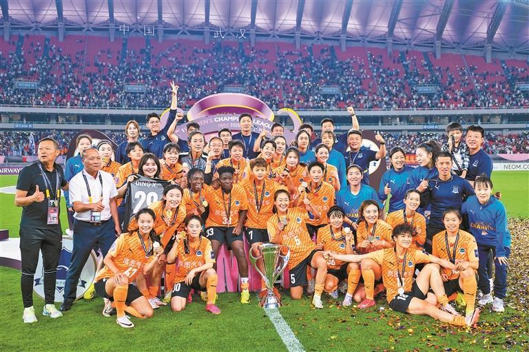 武汉车谷江大女足夺冠后集体合影。