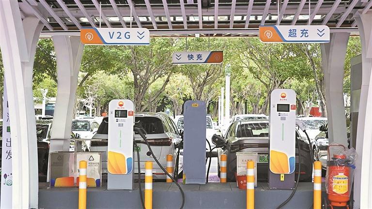 宝安区体育中心游泳馆南侧停车场的光储超充和车网互动一体化示范充电站。