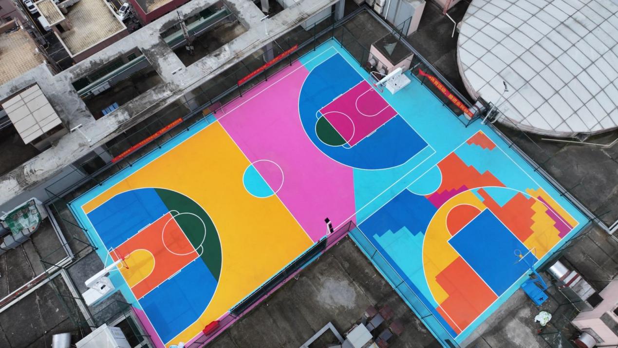 据悉,这个篮球场由沙井京基百纳广场7楼闲置屋顶改造升级而来,历时两个多月。踏上球场,映入眼帘的是红、橙、黄、绿、青、蓝、紫以丰富形态交织而成的炫酷地面,划分出一个半场和一个全场。在雨后晴空下,色彩格外亮眼,运动氛围瞬间拉满。