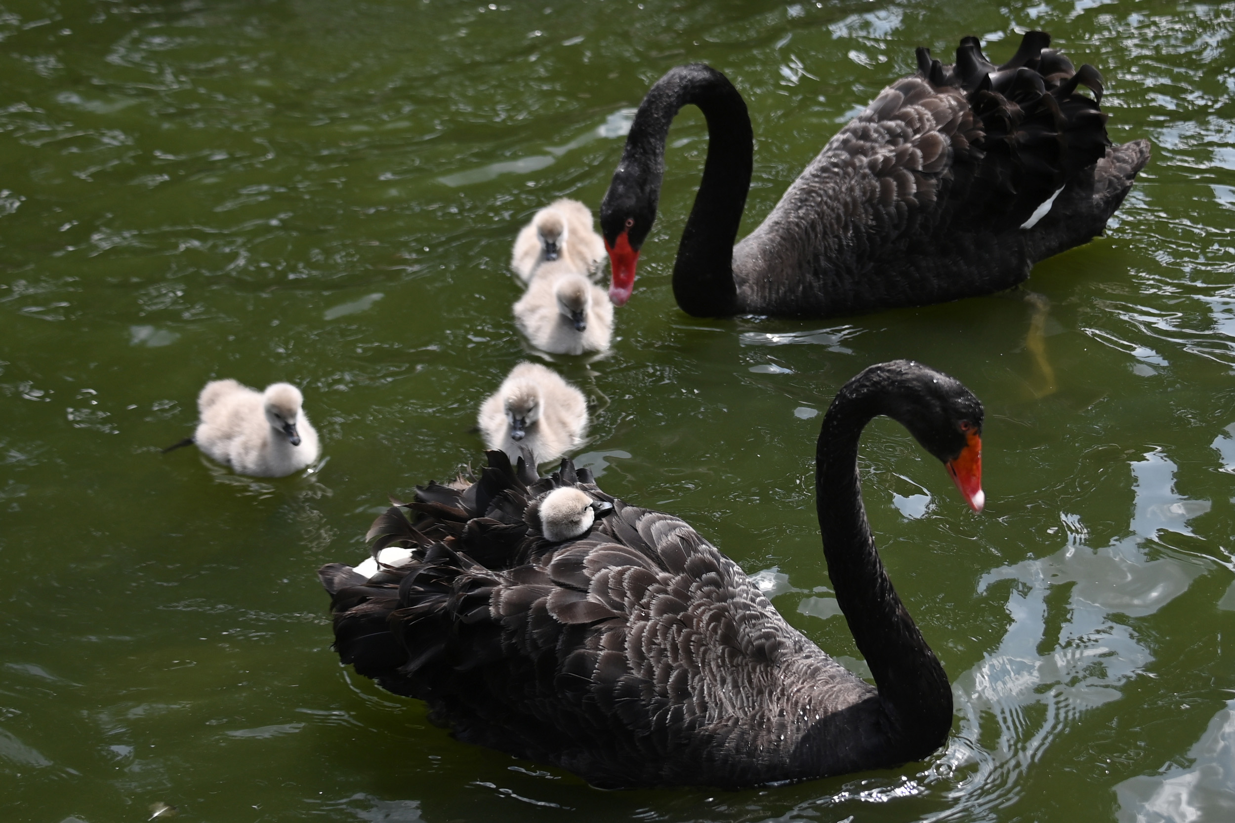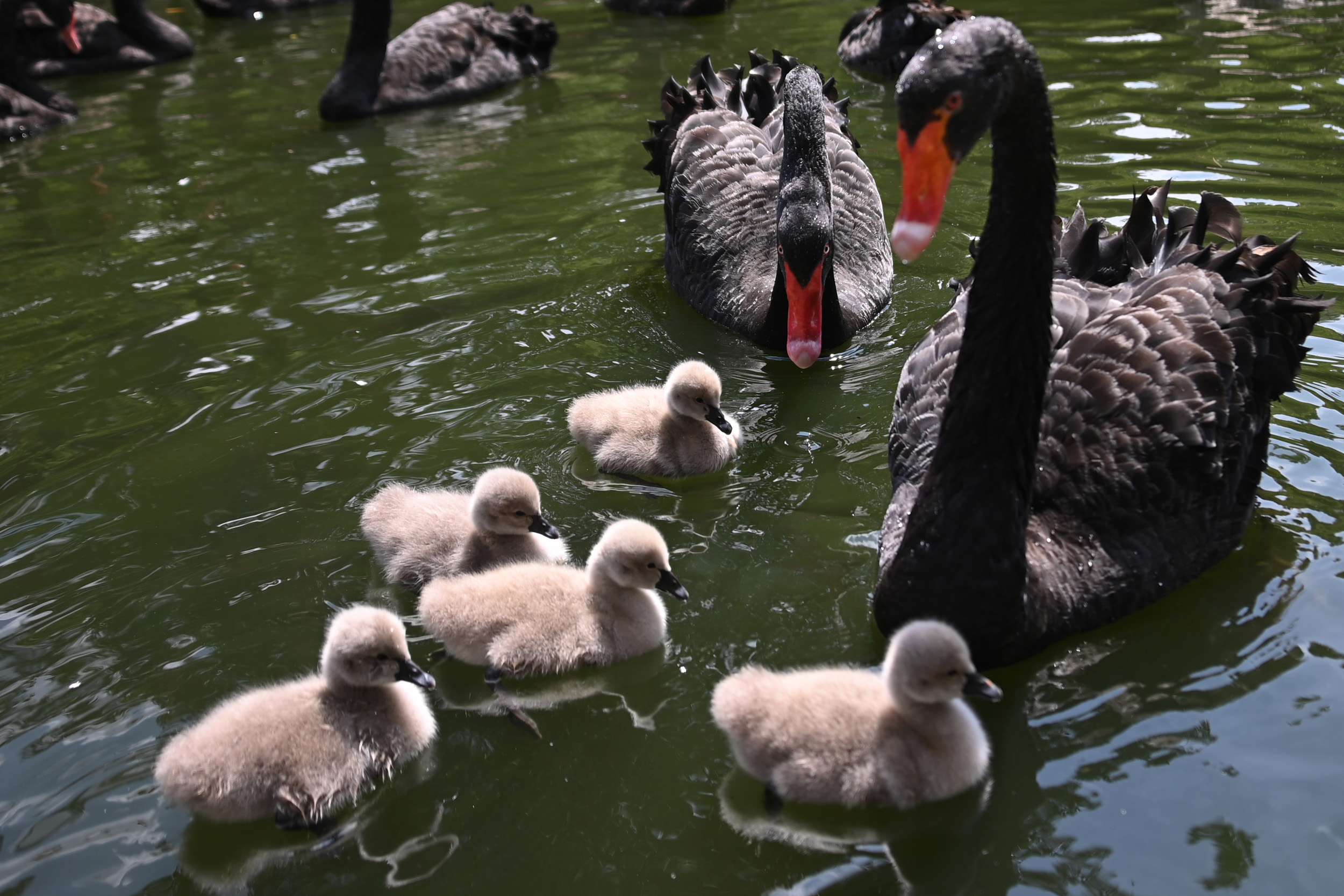 在动物园天鹅湖水面,5只毛茸茸的小黑天鹅在亲鸟的“保驾护航”下惬意地游动。据了解,生活在深圳野生动物园里的黑天鹅,孵化期30天左右。一般情况下,出壳的小鹅在巢里活动一至两天后,亲鸟才会带着小鹅下水活动。