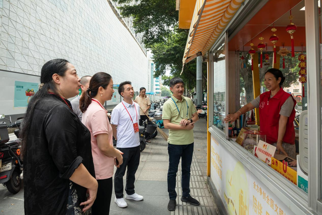 当天下午,文明观察团走进西乡街道的河东社区和大铲湾片区。河东社区面积不大,却集纳了高端酒店、文体中心、时尚商场等商业综合体,是个典型的“小社区大流量”区域。随着城市环境秩序综合整治行动深入开展,这里也在悄然发生着变化:道路规划了电动车停放点、充电点;建筑工地围挡规范,文明宣传随处可见浸润无声;志愿服务U站内,志愿者提供充电、饮水等便民服务,细微举措传递城市温度。“变化肉眼可见,但精细化管理还要加强。”区人大代表王小菲说,比如在管理电动车停放,不仅要加大整治力度,也要做好宣传提醒,让文明习惯从“被动要求”变为“主动养成”。