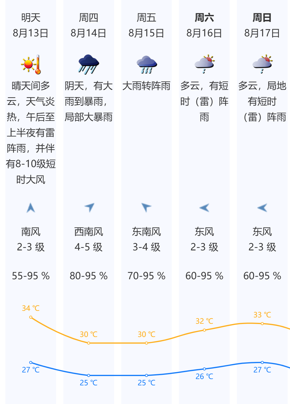 预计13日(周三)高温晴热,午后至前半夜有局地暴雨和8-10级雷雨大风等强对流天气风险;