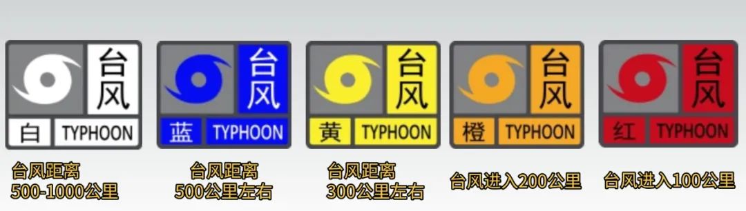 台风预警信号分为五级,分别以白色、蓝色、黄色、橙色和红色表示: