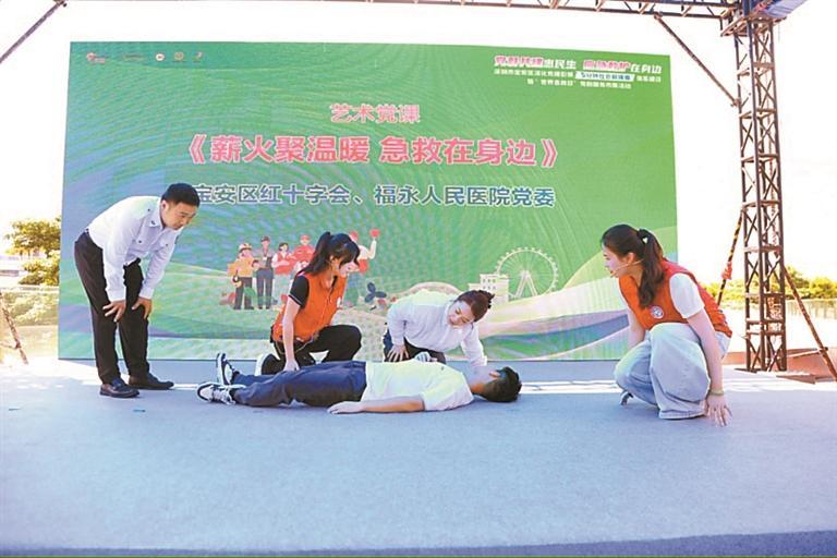当天现场亮点频现,传递急救力量:艺术党课(情景剧)《宝安区党建引领构建“薪火聚温暖,急救在身边”社会急救体系建设》,以生动剧情再现宝安急救体系从无到有、从弱到强的建设历程;现场公布《宝安区流动党员和新就业群体应急救护先锋志愿服务队》名单;西乡街道福中福社区、福永街道聚福社区、福海街道和平社区、新安街道海旺社区、石岩街道塘头社区5个社区获颁“党建引领构建‘5分钟社会救援圈’”最美暖心社区牌匾,宝安区人民医院、区中医院等9家医疗机构被授予社会急救培训教学点牌匾。
