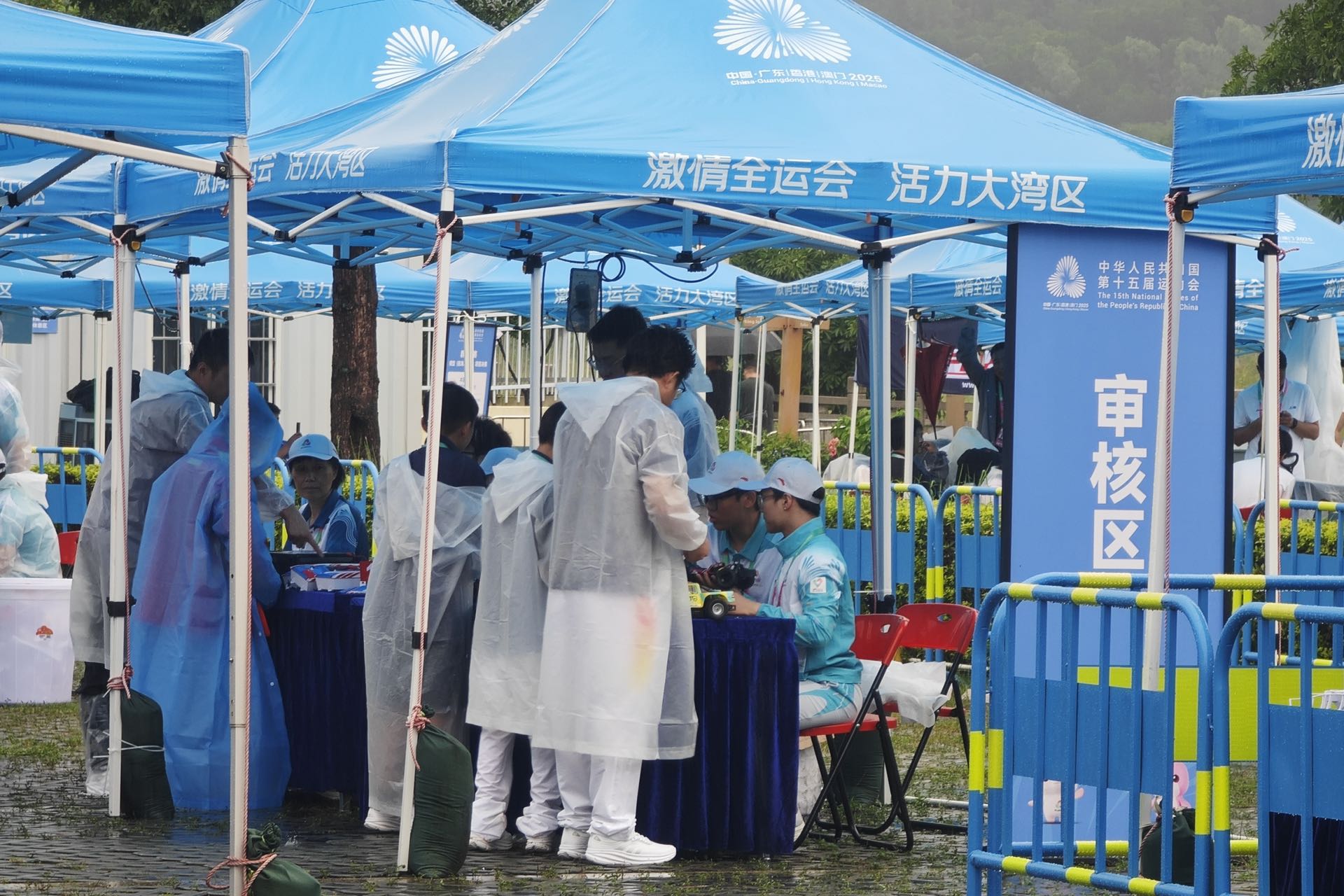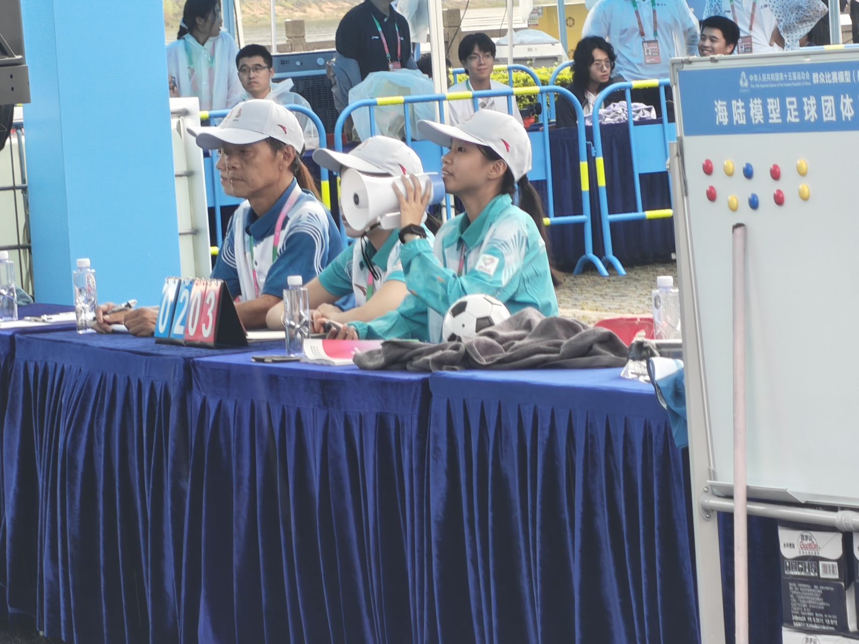 随着开赛仪式的圆满落幕,航海模型仿真航行、耐久项目团体赛以及极具观赏性的海陆模型足球团体赛等项目随即在五指耙水库及周边陆地区域正式展开激烈比拼。尽管受台风影响,赛区出现间歇性强降雨,志愿者们依然坚守岗位,以积极态度面对天气变化。在竞赛处,检录组的志愿者一丝不苟地核对运动员信息与模型参数;场地管理组的成员时刻关注赛道状况,协助处理突发情况;后勤保障组的同学们更是马不停蹄,为各个环节提供坚实的物资与支持……从赛前准备到赛后收尾,志愿者们在各自的岗位上默默奉献,他们的身影活跃在赛场的每个角落,保障着比赛顺畅、安全、高效地进行。