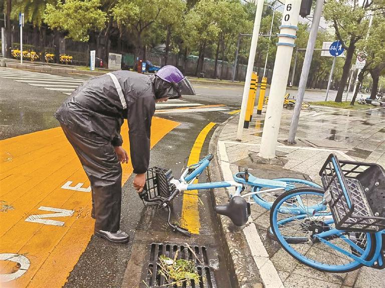9月24日下午,玉塘社区工作人员将被风吹倒的自行车扶起。