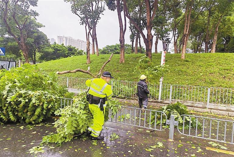 9月24日9:10,光明交警大队铁骑队员协助三防工作人员清理树木,消除安全隐患。