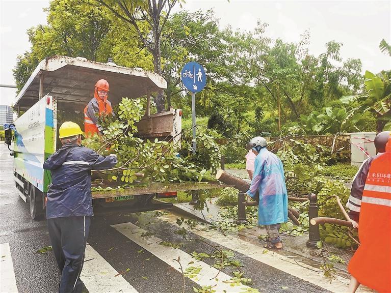 9月24日,受台风“桦加沙”影响,光明区遭遇强风暴雨,多条道路出现树木倒伏、断枝情况。当日下午2点40分,在科泰路,玉禾田公司的环卫工人们冒着风雨,对横倒路中的大树进行紧急清理。电锯声与风雨声交织,环卫工人身着雨衣,相互协作切割树干、搬运树枝,迅速恢复道路通行。
