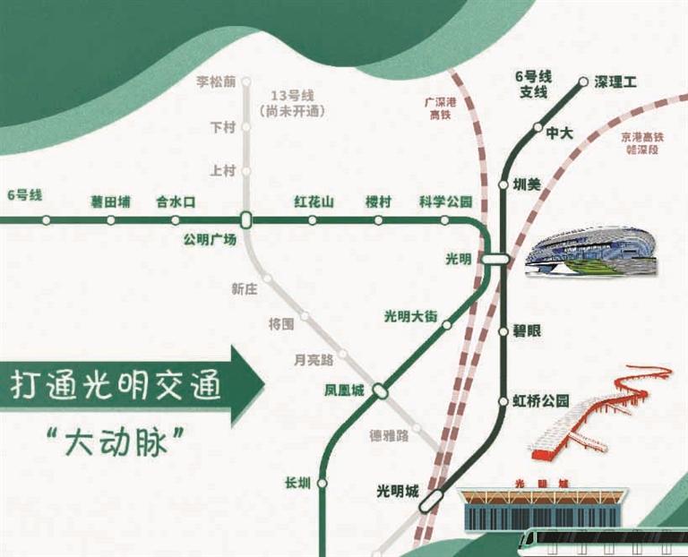 6号线支线二期北起6号线支线一期光明站,南至光明城高铁站,设光明城站、虹桥公园站、碧眼站三个站点。6号线支线贯通,进一步打通了光明南北交通大动脉,对光明区未来发展意义重大。