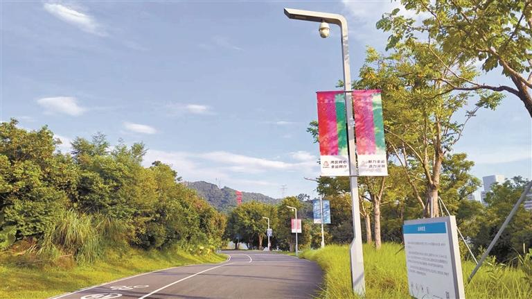 沿着迳口路驶向马术中心,道路两旁“相约粤港澳,逐梦新征程”的灯杆旗形成一道流动的风景线。虹桥公园,同样的标语在绿树掩映下格外醒目。而在光明区城市广场、光辉大道路旁的展墙上,“激情全运会,活力大湾区”的巨幅海报与周边的自然景观相得益彰。