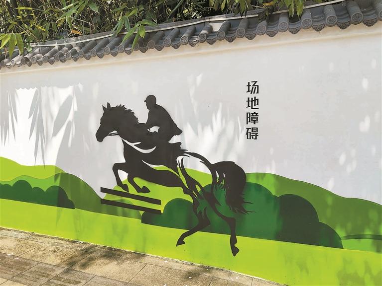 通往光明国际马术中心的光明街道碧果路,则变身成为一个露天的马术艺术长廊。墙上的涂鸦生动描绘着即将在这里举办的马术比赛——场地障碍、盛装舞步、三项赛等项目的精彩剪影。在蛙声阵阵的田园风光中,青瓦下,白墙上,骑手驾驭骏马奔驰的画面栩栩如生,与周边良好的生态环境相映成趣。