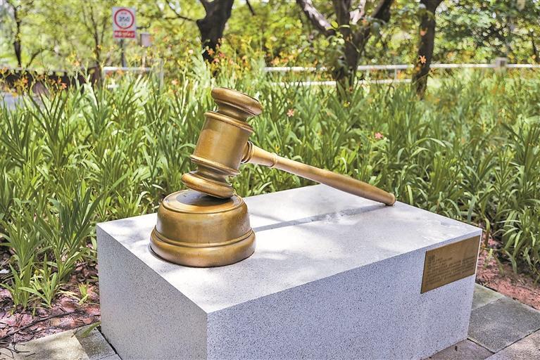 二级雕塑区分为“廉洁物件”与“古代清官”两大主题板块。在“廉洁物件”区,“法槌”“规矩”“警钟”“镜鉴”“鼎语”等雕塑依次排列,形成独特的廉洁文化符号矩阵。“法槌”雕塑以法槌和底座结合的造型,寓意法律的公平与威严;“镜鉴”雕塑以仿古铜镜为原型,镜面图文华丽,铭文丰富。“以铜为镜,可以正衣冠”,引导参观者反观内心、自省自律;最具互动性的当数“警钟”雕塑,游客轻叩即可发出清亮声响,强化“警钟长鸣”的心理暗示。