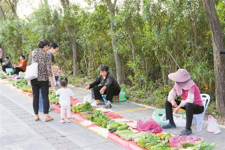 在观天路人行天桥旁的菜地管控区(黄区),多位本地菜农正有序售卖新鲜蔬果,每个摊位前都整齐摆放着《社区摊贩经营场所登记卡》。“这里是专门为本地菜农设置的销售点,摆摊时间限定在下午4点至晚上8点,期间严禁占用盲道、堵塞消防通道,还得及时清理垃圾。”工作人员介绍,除该点位外,街道还在章阁市场、兆丽花园、第三十五高工地等多地设置同类管控区,既方便菜农销售自产农产品,也为市民购买新鲜蔬菜提供便利。