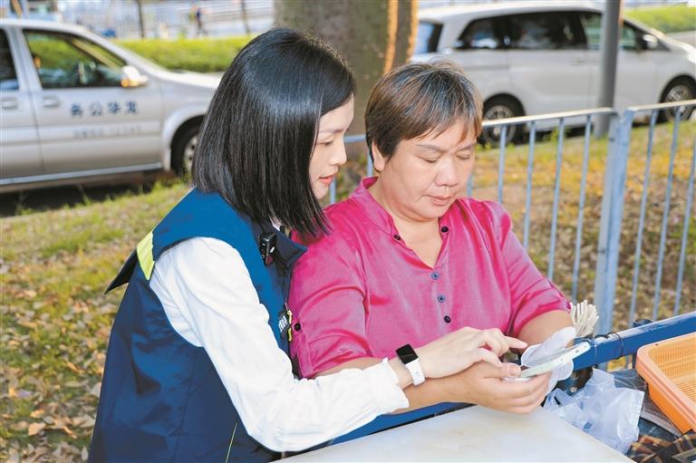 ▲工作人员协助摊主进行摊位申报。
