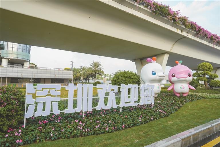 ▲从深圳宝安国际机场出来,沿途可以看到精心设计的欢迎花坛,十五运会和残特奥会吉祥物“喜洋洋”“乐融融”伫立其中。