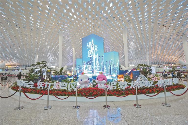 ▲在深圳宝安国际机场出发大厅,可以看到巨型花坛中伫立着十五运会和残特奥会吉祥物“喜洋洋”“乐融融”及相关宣传标语。