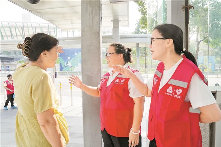 赛场外,如火焰般的“志愿红”以执着身影,点亮城市文明之窗。与“小海豚”一样坚守志愿服务岗位的,还有众多城市志愿者。他们在场馆周边、交通枢纽、地标商圈、机场、文旅景点等重点区域,面向社会公众提供赛事资讯、信息咨询、交通指引、文明劝导等志愿服务,依托全区志愿服务站、党群服务点为市民提供便民服务。他们中,有的是从参与“大运会”到参与“全运会”,用数年甚至数十年的坚守,见证志愿服务“升级”,书写志愿精神传承。