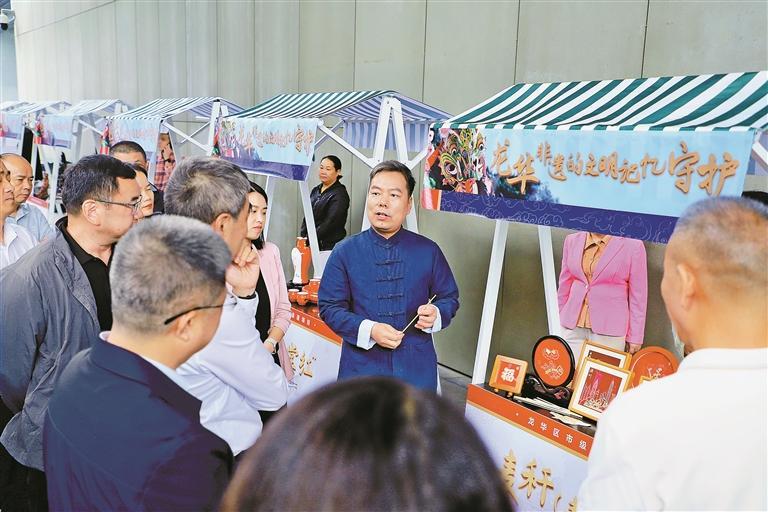 ▲市民在区政协非遗文化科普活动中了解龙华区各级非遗项目的独特魅力。