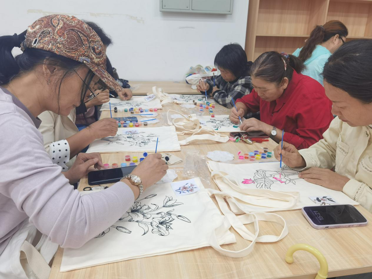 ▲上川社区长者制作手工包。