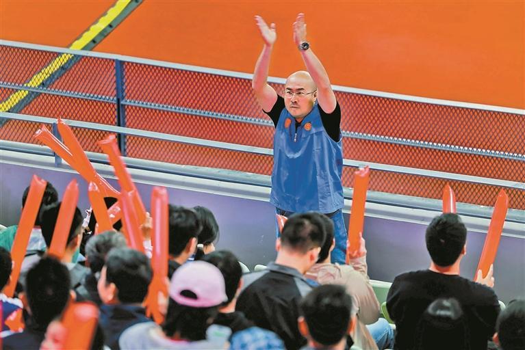 比赛中,“蓝马甲”不仅是服务者,更化身为啦啦队主力。他们组织现场4000余名观众,以整齐的口号、热情的呐喊为运动员加油助威。伴随着两台大锣鼓的节奏擂动,现场气氛持续升温,呐喊声此起彼伏,将比赛推向高潮。“能以工会服务者身份参与这场赛事,我觉得非常荣幸”“大家都比较文明,排队也很有秩序”……现场,工会“蓝马甲”们默契配合,现场井然有序。宝安工会以周到细致的服务,为这场高水平赛事增添了温暖动人的色彩。