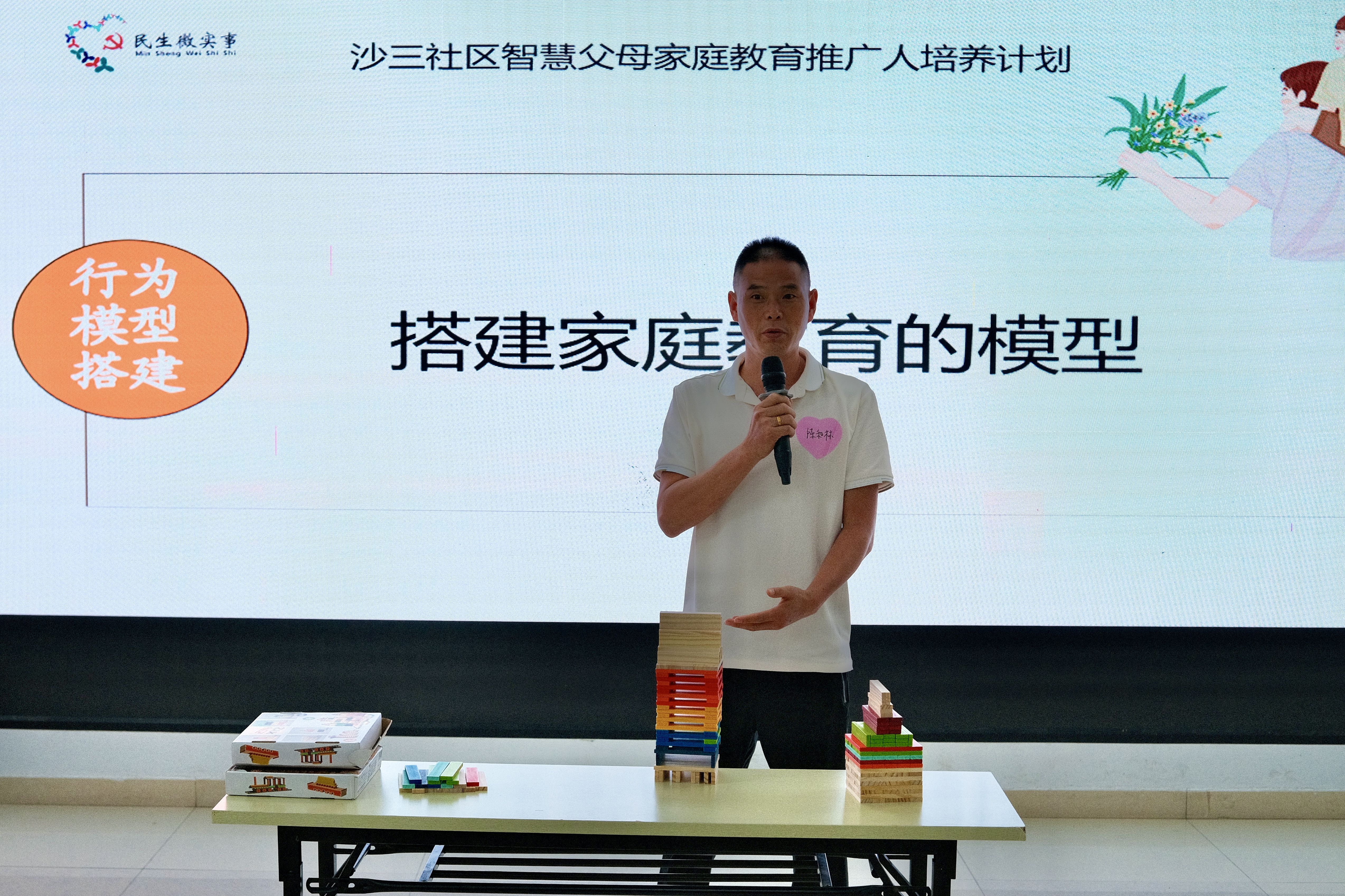 如何做好家庭教育,社区居民有着迫切需求。沙三社区以民生微实事项目的形式,启动了“建立智慧父母成长营,培育家庭教育推广人”项目,通过项目培育家庭教育“种子父母”,进而引导其成为“家庭教育推广人”,开展家庭教育普及推广,实现家庭教育遍地开花与社区德治相得益彰。