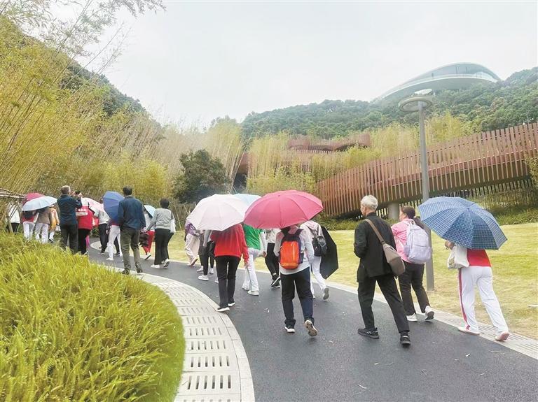 一路上,大家三五成群,边走边聊,不时分享着生活中的趣事。途中的任务打卡环节让此次行程充满乐趣。有的老人用客家话热情打招呼:“大家好!涯系王阿婆。”有的用潮汕话介绍自己的家乡重阳节的特色习俗。还有老人用江西话打招呼,话音刚落便有几位老人举手认老乡,浓浓的乡音充满亲切感。