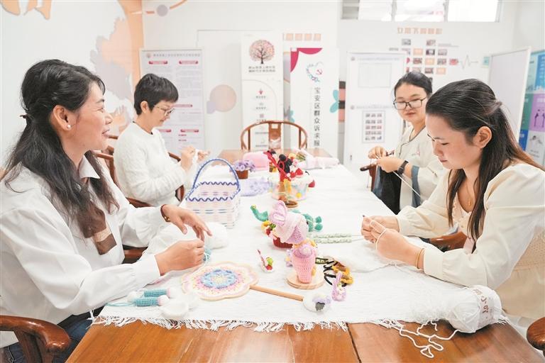 “沙、沙、沙……”11月3日,新安上合社区党群服务中心一楼的活动室里,钩针与毛线轻柔摩擦,发出细碎而规律的声响。几位女性围坐在长桌旁,低头专注,手指灵巧翻动。