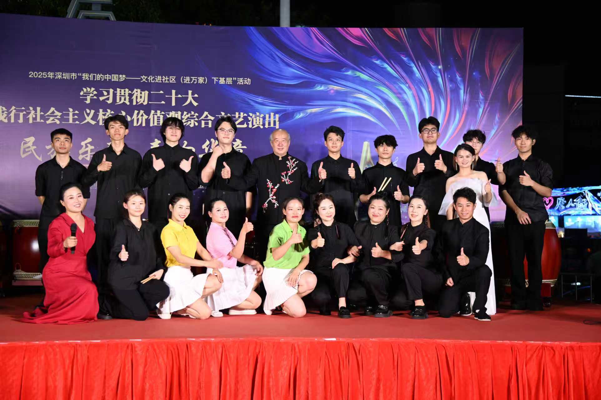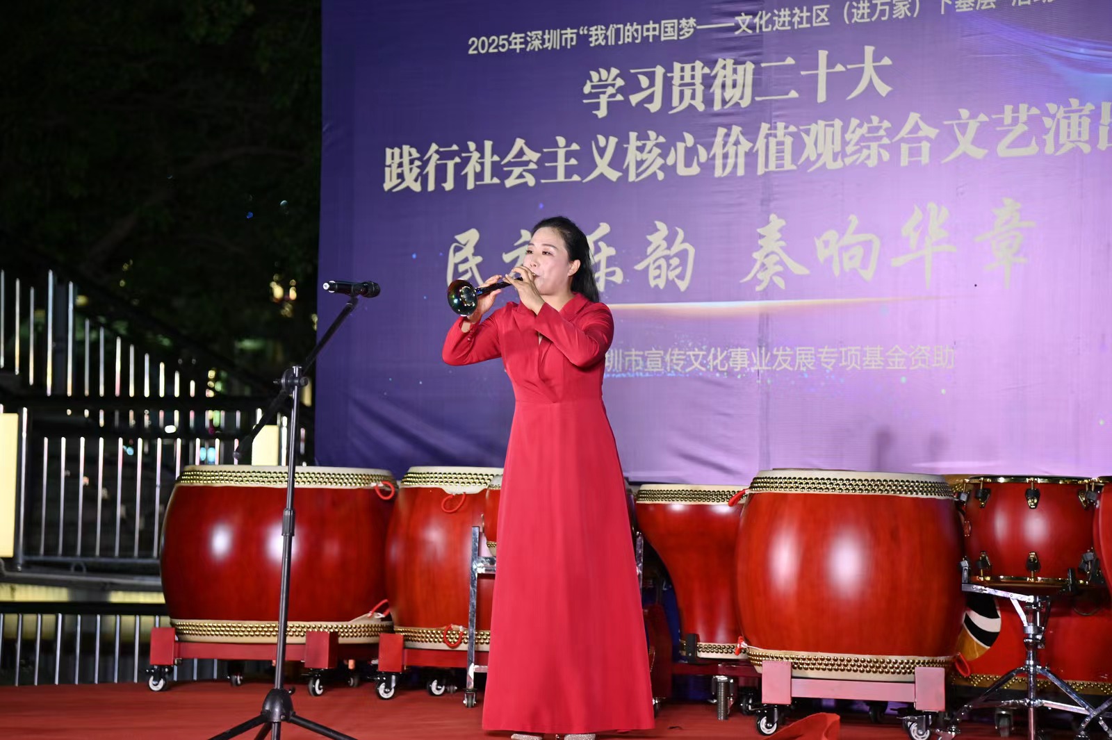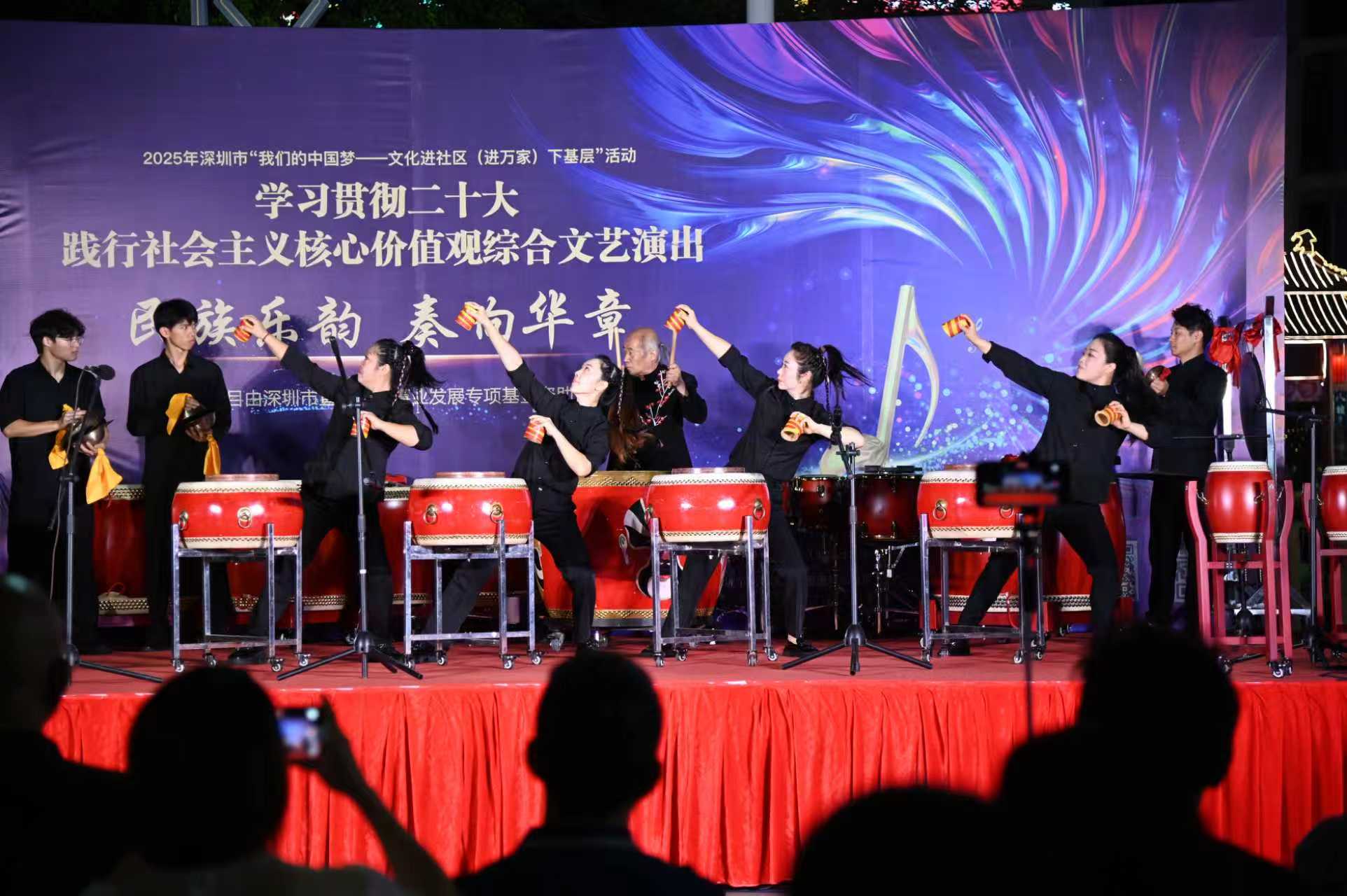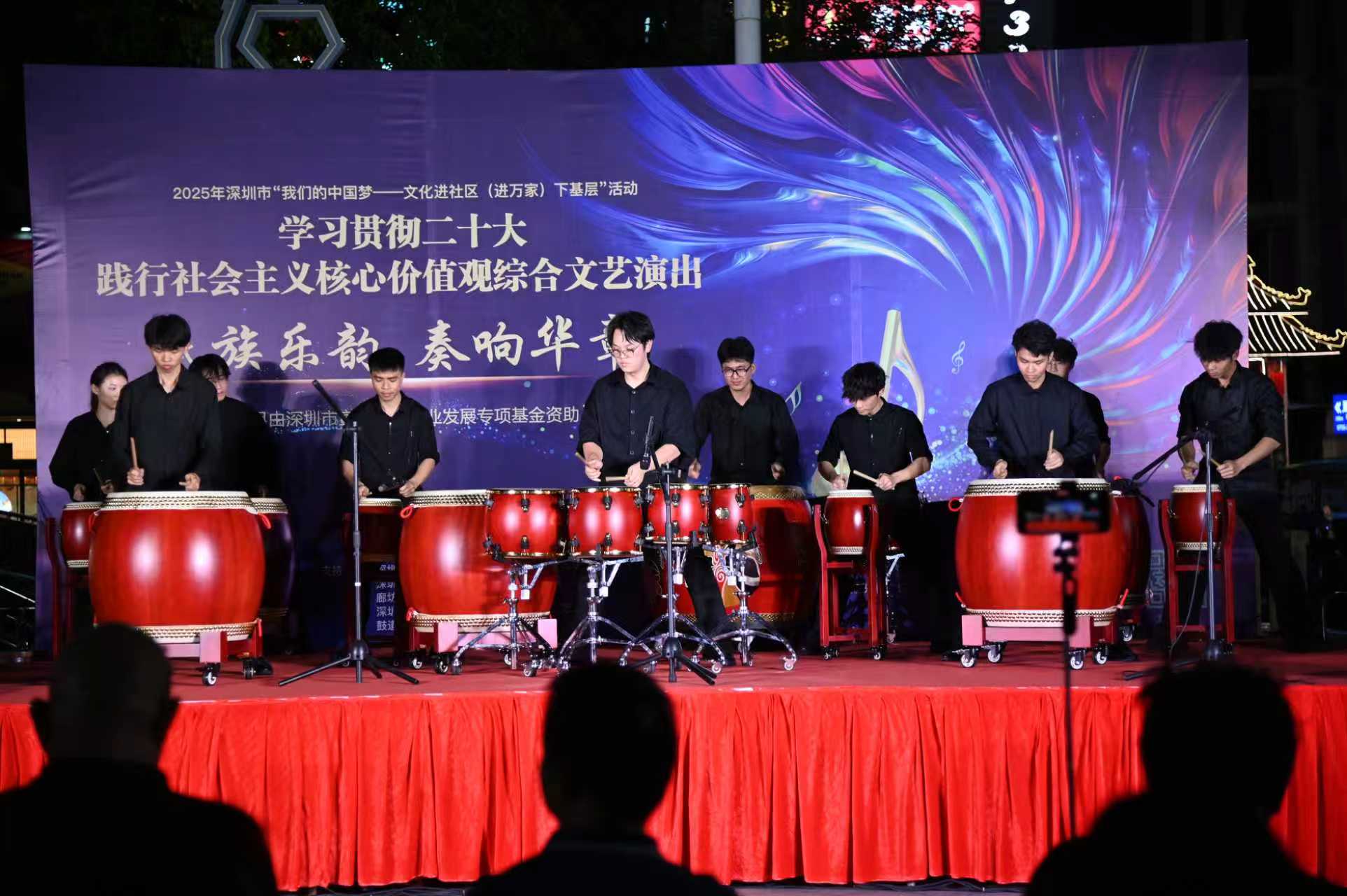 近日,龙华区福城街道章阁社区乐群广场鼓声激荡、气氛热烈,数百名观众齐聚一堂,共同欣赏由深圳市安志顺打击乐艺术团带来的文艺演出《民族乐韵奏响华章》。