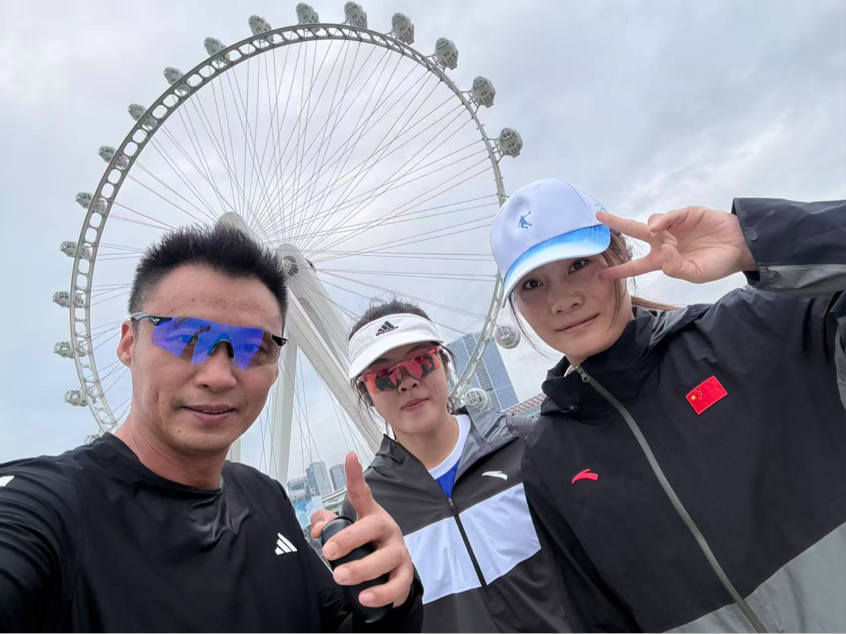 ▲赛前,汪丽娜(右)与教练、队友在摩天轮下跑步放松心情。