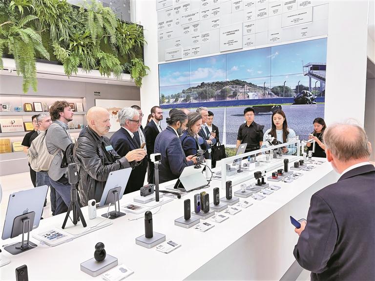 在资本市场瞩目的“智能影像第一股”影石创新,其连续8年全球市场份额第一的全景相机技术,为机器人视觉感知提供了更多想象空间。不止于此,影石创新技术储备持续扩容并加速产品迭代,在2025年上半年里,影石创新推出了全景相机X5、GO Ultra等消费级智能影像设备。基于全景影像技术优势,其还将业务版图进一步延伸,联合第三方团队推出影翎Antigravity A1全景无人机。欧洲嘉宾对其技术迭代速度与市场能力表现出浓厚兴趣,并纷纷拿起拇指相机、运动相机等拍摄体验。