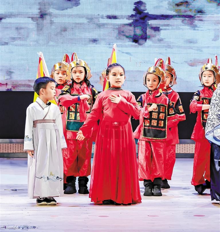▲孩子们在舞台上以铿锵台词和饱满激情,演绎巾帼英雄花木兰的英姿。