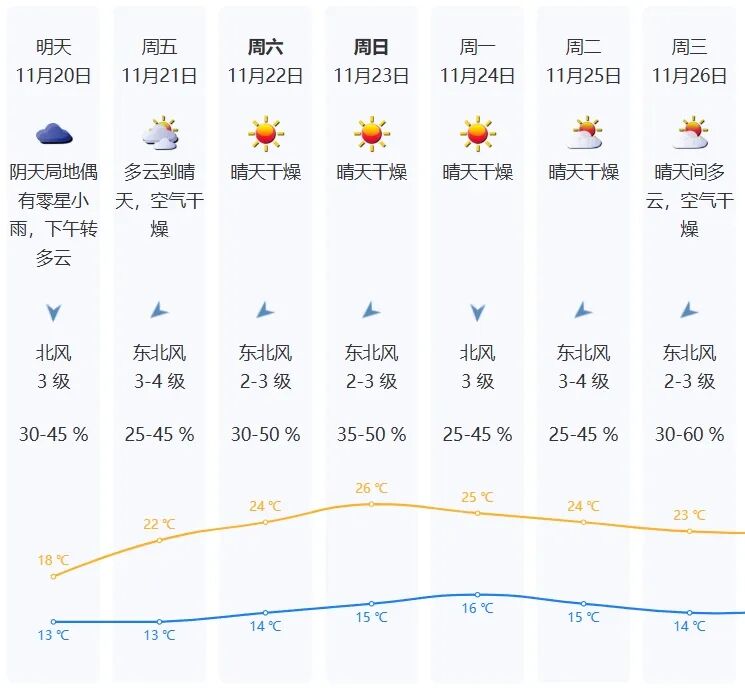 20日冷空气减弱,阴天局地偶有零星小雨,下午渐转多云,气温回升至13-18℃,偏北风沿海、高地和海区最大阵风6-7级。