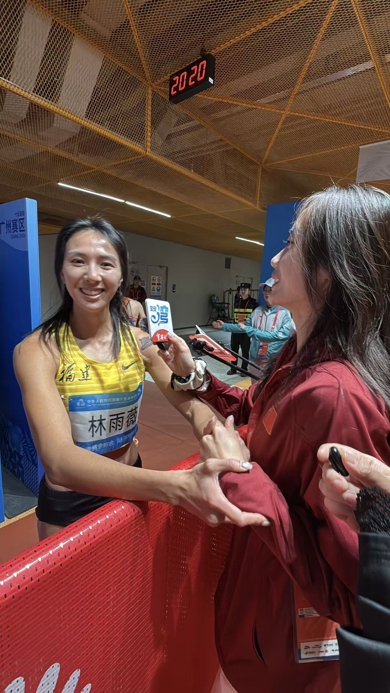 她“抓到”的第一位采访对象,是福建队短跑选手林雨薇。林雨薇看到面前站着的是曾蕊时,直接愣了一下,“没认出来”成了她的第一句反应,引得周围一阵轻笑。适应了身份变化后,曾蕊便自然进入采访节奏,先询问比赛感受,又在听到林雨薇担心成绩判定时第一时间安慰对方,两人还相约未来目标是一起站上最高领奖台。