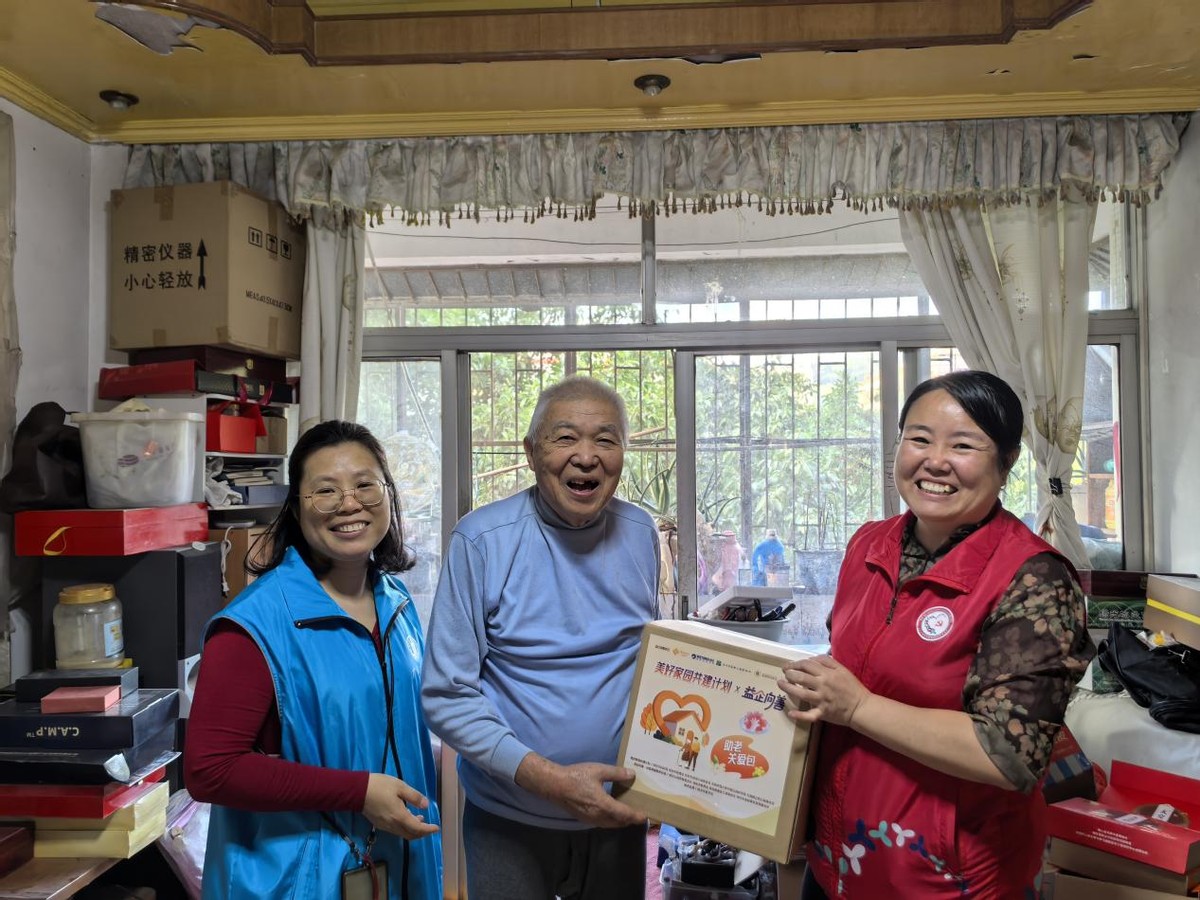 活动中准备的关爱物资种类实用,包括蛋白粉、沐浴露、红花油、维生素等,都是老人们日常所需。考虑到大部分老人年纪大、行动不便,社工和志愿者主动上门,将物资一一送到他们家中。