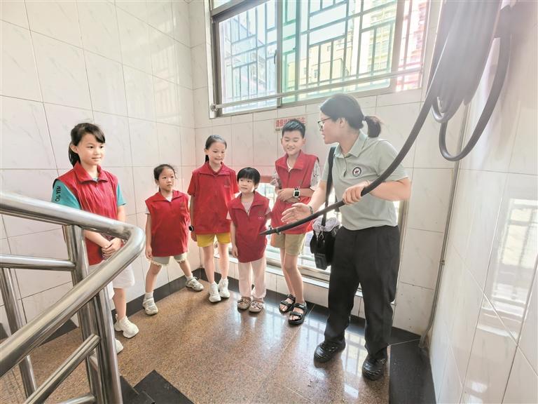 今年来,冯美金在街道两期“小小网格员”体验营中担任讲师,打造生动的“网格实践课”。她采用“实地教学+亲身体验”方式,带领孩子们认识灭火器、消防水带等装备,手把手指导孩子们操作。她还在小区提前设置模拟隐患,带着“小网格员”们逐一排查。在她的引导下,孩子们从最初的羞涩模仿到自信“喊话”提醒居民注意安全,成了社区安全的“小小传播者”。