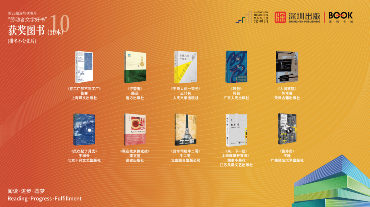 改革开放以来,城市飞速发展,这背后离不开一大批劳动者的辛勤付出。深圳读书月“劳动者文学好书”已连续成功举办八届,评选出《工厂男孩》《深圳宅女》《街巷志》《生活在低处》《我的皮村兄妹》等一批具有影响力和号召力的劳动者文学作品。本届评选自10月启动,受到出版界与文学界积极响应,历经初评、终评,最终10本“劳动者文学好书”脱颖而出、重磅出炉。它们是从流水线、写字楼、社区巷陌中生长出的文字,是献给这个时代的劳动备忘录。
