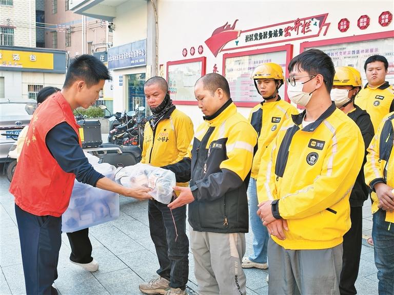 ▲大水坑社区党委为骑手们送上“暖冬三件套”。